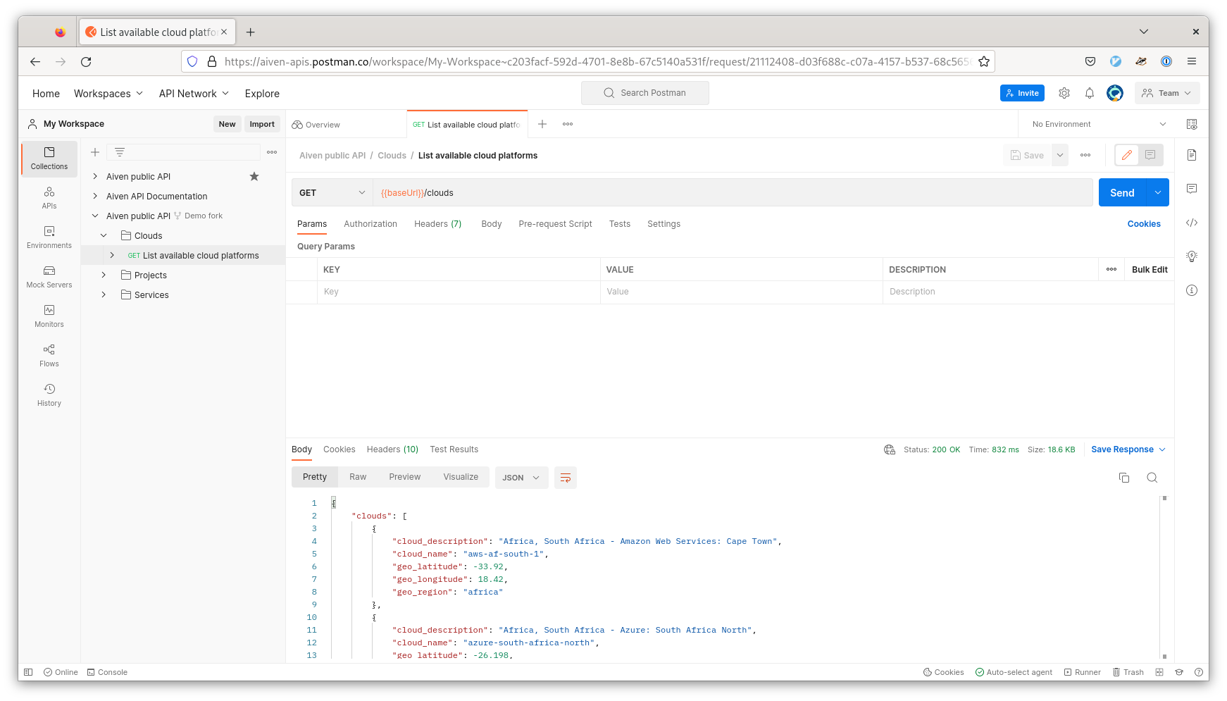 Expand your collection in the left-hand bar and click on “Clouds”. The request you want is called “List available cloud platforms”, and it doesn’t need any editing or changes. Go ahead and click the “Send” button over on the right-hand side.