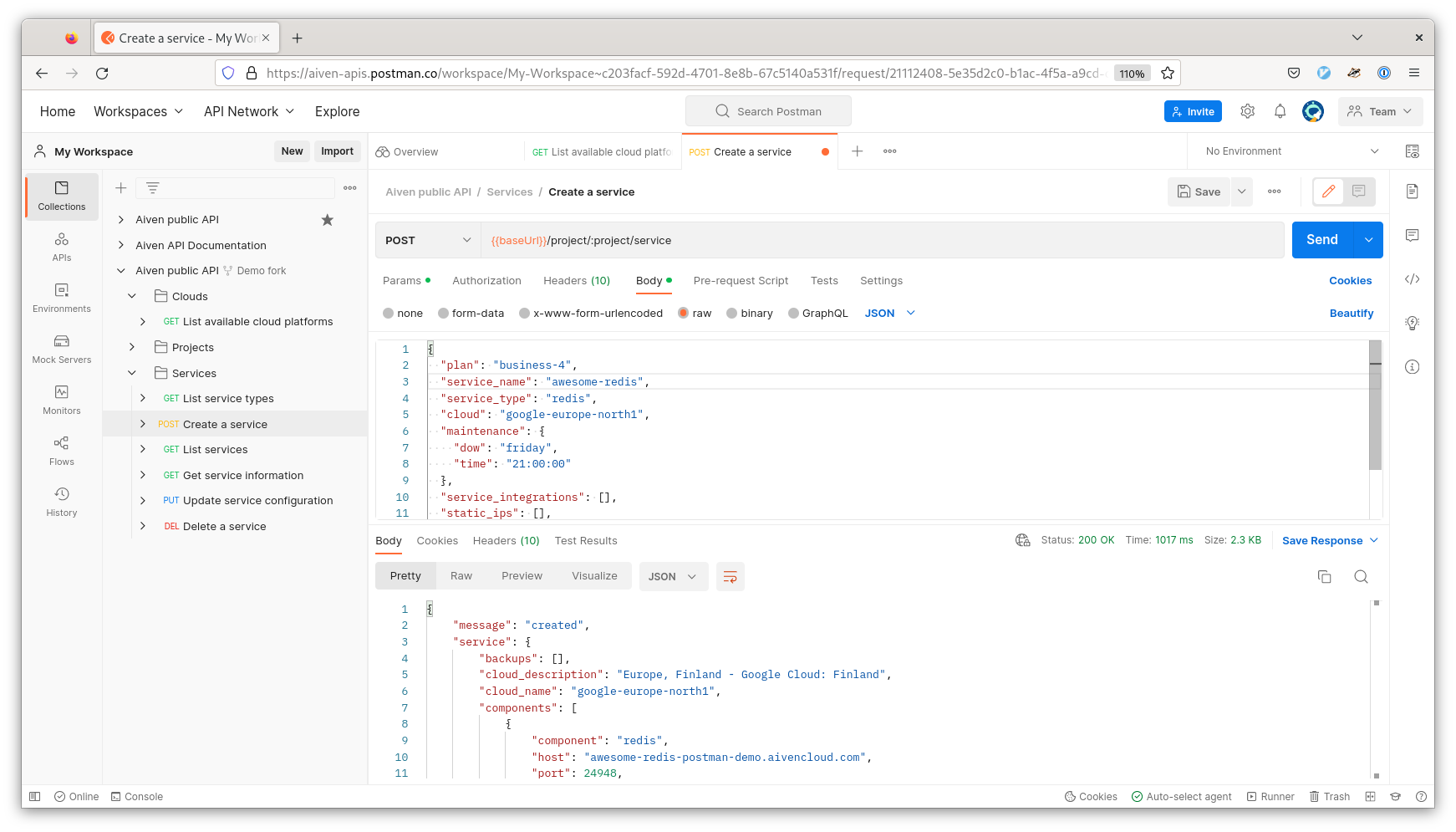 Whether you use Postman for your day-to-day tasks, or use it as an excellent way to get to know a new API, the Aiven Postman collection gives you a way to get started quickly.