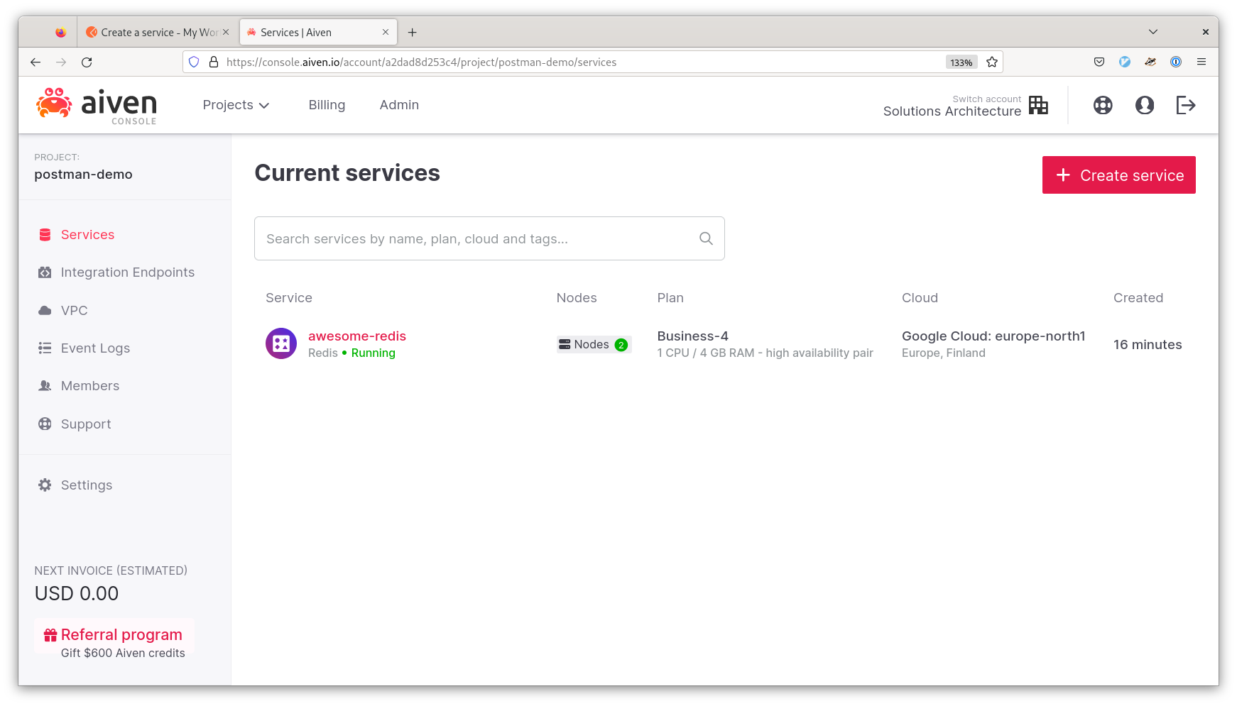 The right status code and some JSON is a good outcome, but it’s not very exciting, is it? Head back to your Aiven console and you should see a new Redis service.